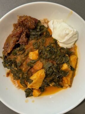 A hearty fish curry with Balti seasoning, and vegetables enough to make a single bowl meal.
