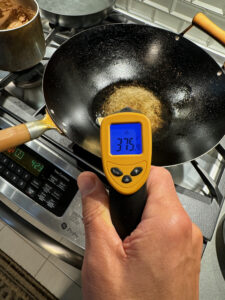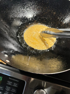 - When you are finished, turn off the oil. Use it to make something else yummy, like fried potatoes. We usually use a paper towel to reduce the amount of oil left in the pan and use the wok to stir-fry the veggies for the meal (broccolini and kale, for example).