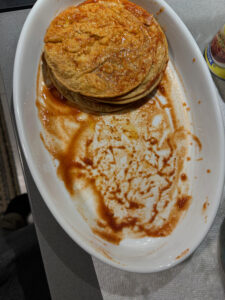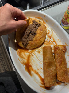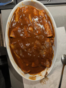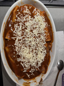 - Take any excess filling and just spread it on top. This works particularly well with bean fillings. In the picture above, the enchiladas on the bottom have had extra filling spread on them.
