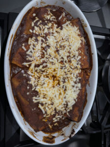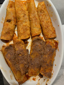 - Place the rolled enchiladas into the other side of the baking pan. Continue on until you have done half.