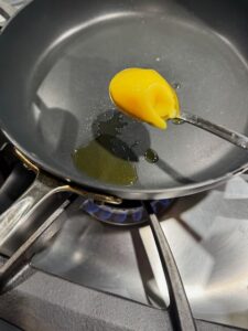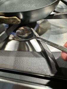 - Optional: if you have a gas stove and the burner is now on, you can warm up your ghee spoon in the flame to make it easer to scoop the ghee