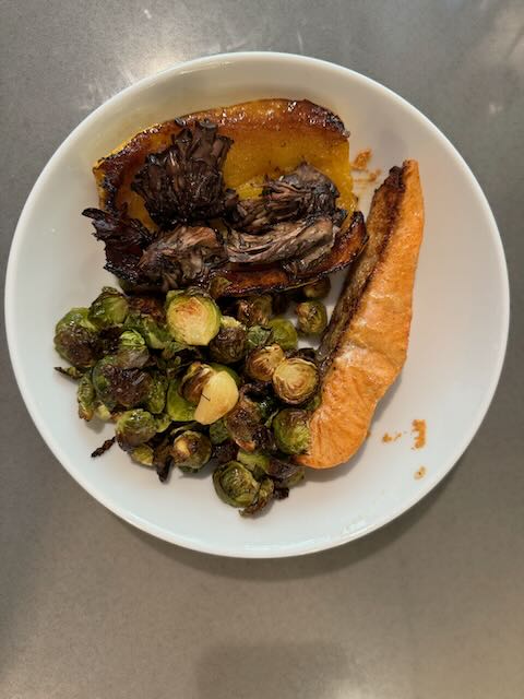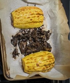 Roast in oven at 425 °F for 25 minutes. The outside of the squash should have brown spots from roasting, and the mushroom should be dark but not burnt (too much)