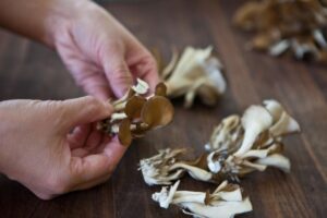 - Put the mushrooms in a small mixing bowl. Maitaki usually come in a big clump, first cut off the "roots" and then break into pieces the size of two fingers. It doesn't have to be accurate.